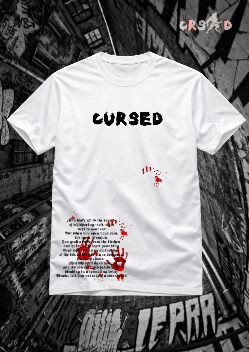 The front stays clean with the CURSED mark and subtle coded print near the hem, made only for those who look closer.